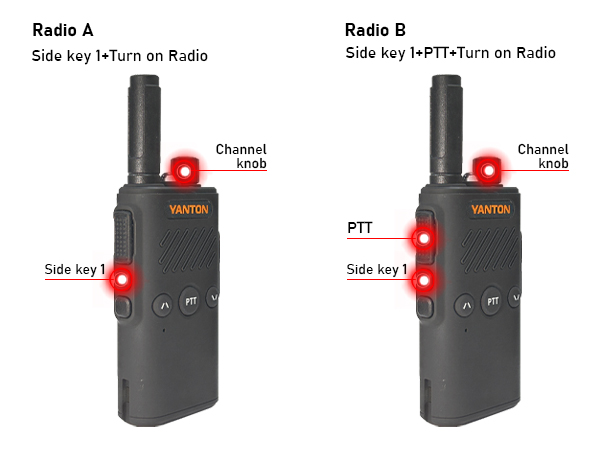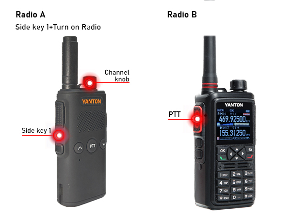 4. On Radio B (transmitter), simultaneously press and hold side button 1 and the PTT transmit button and power on. The voice prompt "Team Receive" will sound, and the current indicator light turns red.